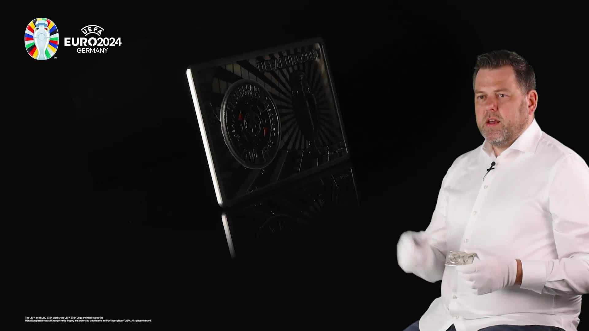 Das Set vereint die erste offizielle deutsche 11-Euro-Gedenkmünze mit dem offiziellen UEFA-Gedenkbarren aus reinstem Silber (999/1000), und das in bester Prägequalität Polierte Platte. Die Vorderseite des Loch-Barrens präsentiert den berühmten Henry-Delaunay-Pokal, der durch einen ihn umgebenden spektakulären Hologramm-Effekt auf besondere Weise hervorgehoben wird. Das Rückseitenmotiv zeigt das Emblem der UEFA EURO 2024™ sowie ausgewählte Wahrzeichen der deutschen Hauptstadt, wie die Siegessäule und den Fernsehturm. Auf der 11-Euro-Münze wiederum lässt sich die ikonische Dacharchitektur des Berliner Olympiastadions erkennen, wo am 14. Juli das Finalspiel ausgetragen wurde.