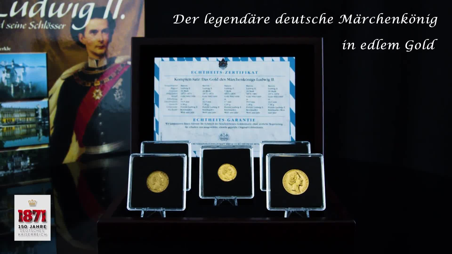 König Ludwig II. von Bayern wurde auf fünf Goldmünzen verewigt, die alle Teil dieses Komplett-Sets sind: