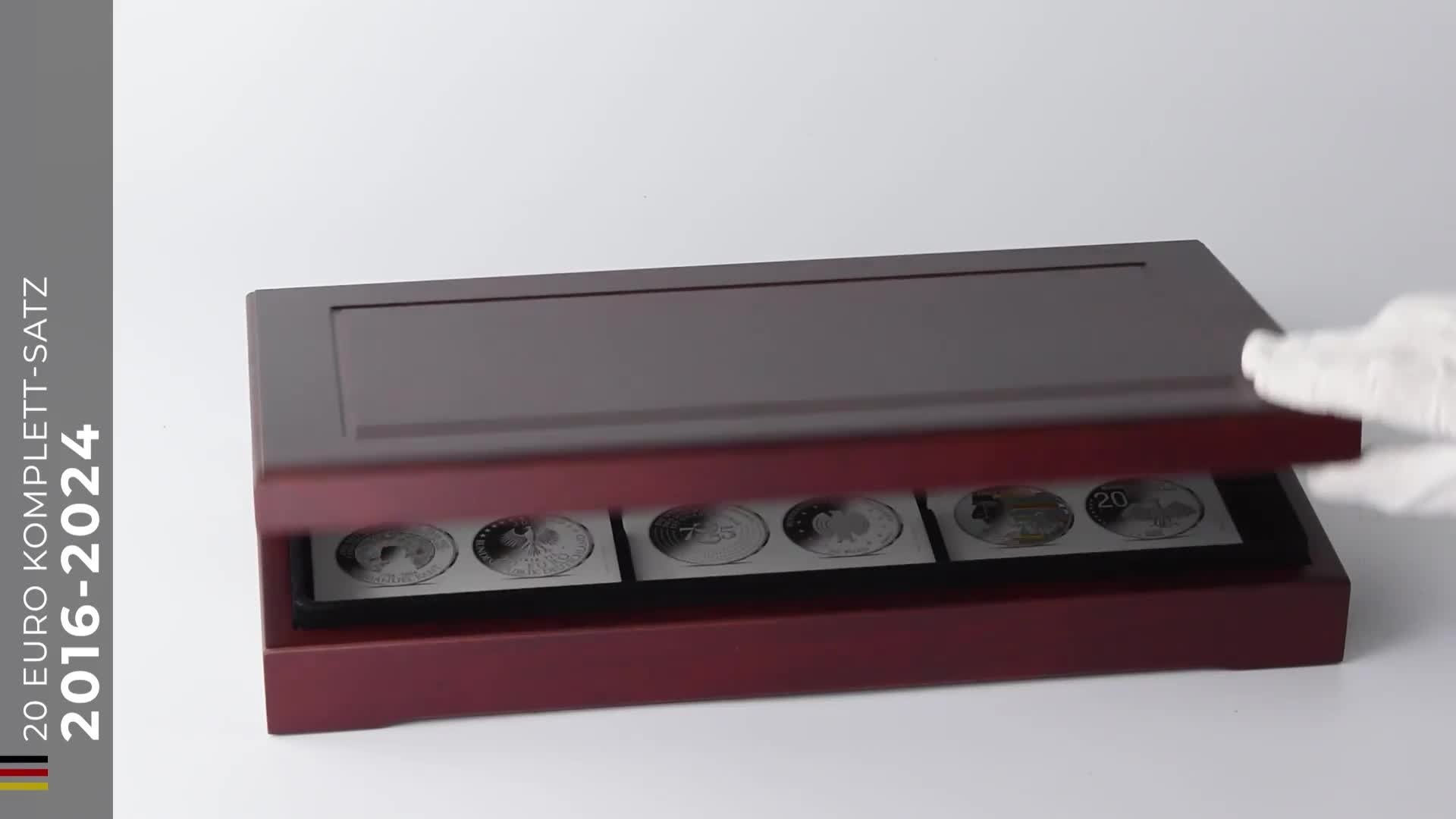 Mit diesem Komplett-Satz können Sie alle bisher verausgabten 20 Euro Silbermünzen von 2016-2024 in der begehrten Sammlerqualität Stempelglanz auf einen Schlag besitzen und dabei bares Geld sparen – ca. 15 % Preisvorteil gegenüber den derzeitigen Einzelverkaufspreisen. Sie erhalten diese einmalige Silbermünzen-Sammlung in einer hochwertigen Holzkassette inklusive Echtheit-Zertifikaten. Jede Münze ist durch eine Acrylkapsel geschützt.