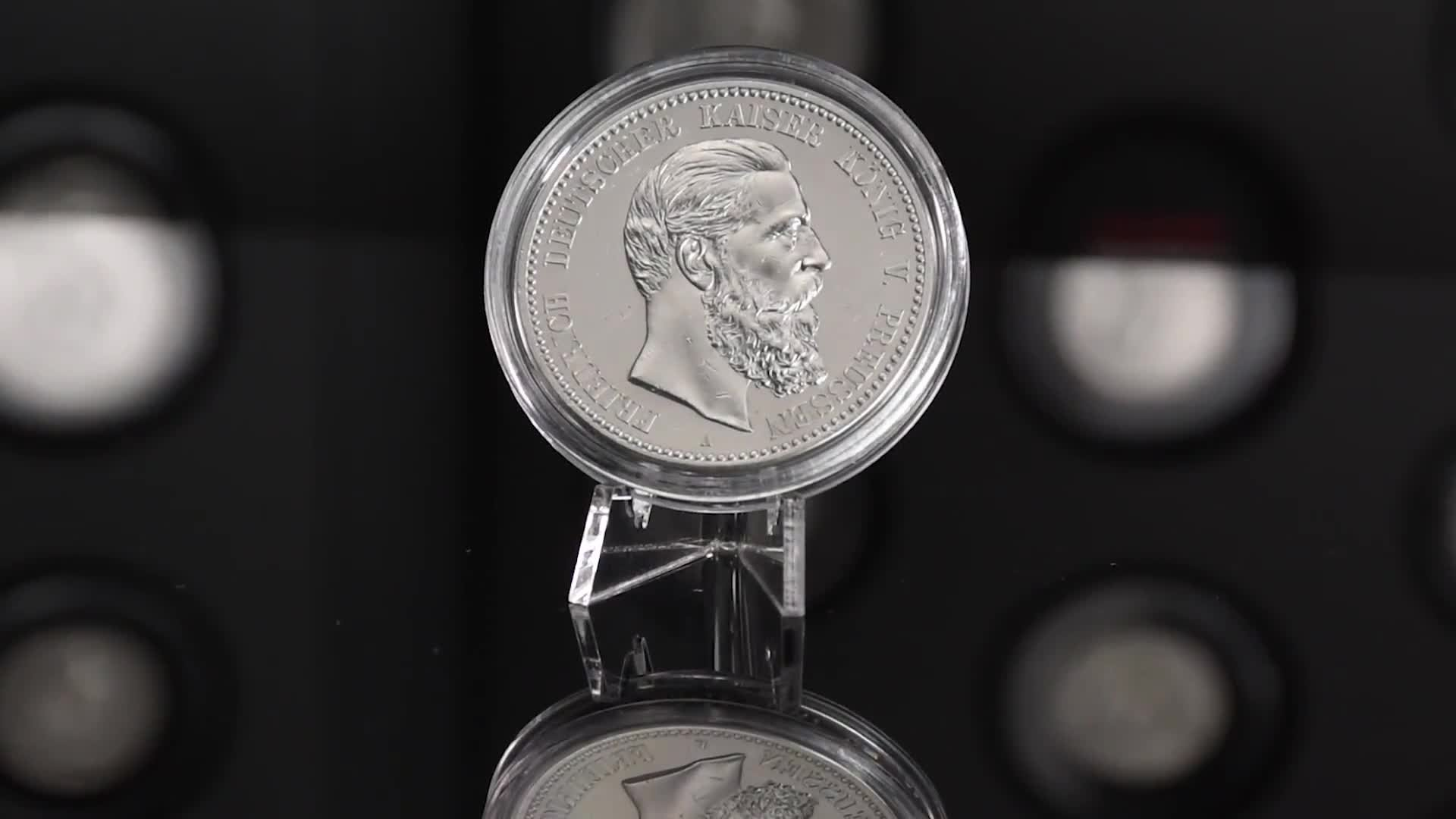 In Zusammenarbeit mit Franz-Friedrich Prinz von Preußen möchten wir Ihnen die echten Silberschätze seiner Vorfahren vorstellen. Dazu haben wir die 20 Silber-Münzen, die unter Wilhelm I., Friedrich III. und Wilhelm II. zwischen 1871 und 1918 geprägt wurden, in einer faszinierenden Kollektion zusammengefasst. Die historischen Originale wurden allesamt aus massivem Silber (900/1000) gefertigt und mit einem Nennwert von 2, 3 und 5 Mark versehen.