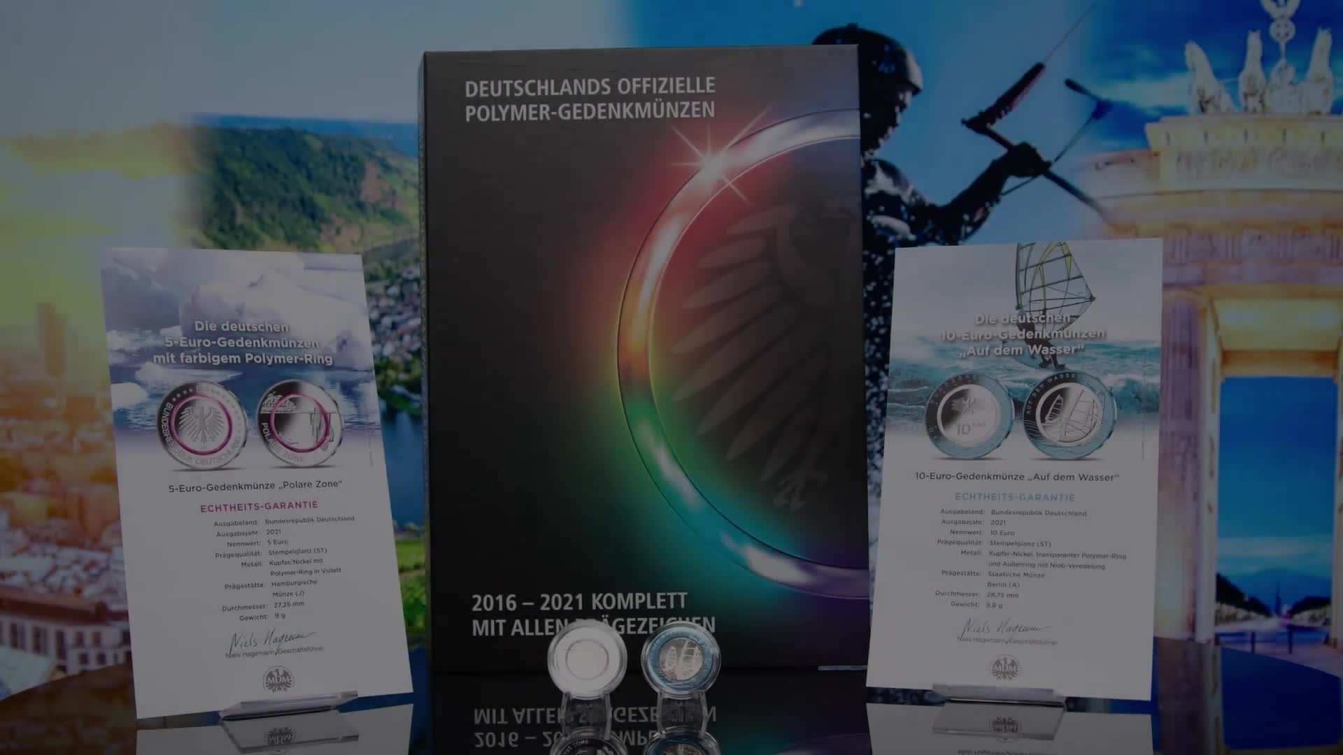 Erstmals sind alle offiziellen deutschen 5- und 10-Euro-Gedenkmünzen mit Polymer-Ring in einer einzigen Sammlung vereint – komplett mit allen fünf Prägezeichen A, D, F, G und J! Diese in jeder Hinsicht spektakuläre Komplett-Sammlung ist nur bei MDM erhältlich.