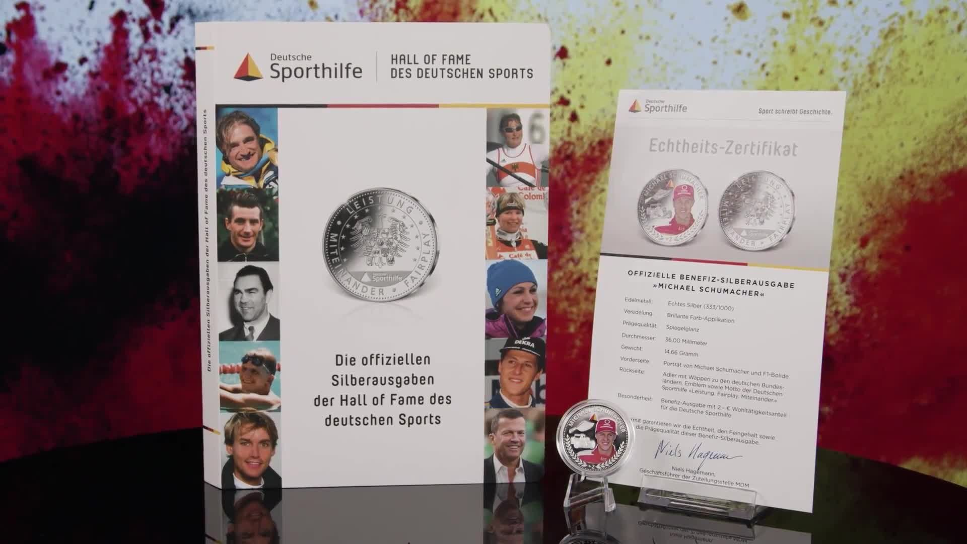 Zu Ehren dieses Ausnahmeathleten wurde Michael Schumacher in die Hall of Fame des deutschen Sports aufgenommen. Passend dazu gibt es nun eine besondere Benefiz-Ausgabe der Deutschen Sporthilfe aus echtem Silber (333/1000) in der höchsten Prägequalität Spiegelglanz. Eine kunstvolle Farbveredelung rundet das Portrait brillant ab.