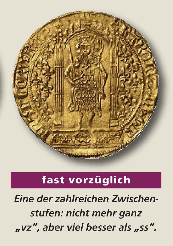 - ss - "Sehr schön": Echte Spuren des Gebrauchs an den höchsten Stellen des Reliefs und der Legenden. Das Münzbild ist in allen Details gut erkennbar. Haarzeichnungen, Kronen, Wappen etc. dürfen leicht verwischt sein.
