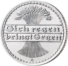 Die erste Münze, die in der Weimarer Republik herausgegeben wurde, war dieses 50-Pfennig-Stück. Da noch kein Republik-Emblem feststand, verwendete man eine Ährengarbe und den Spruch „Sich regen bringt Segen“ für die Rückseite.